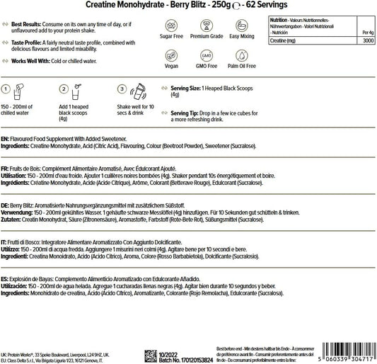 THE PROTEIN WORKS Monohidrato De Creatina En Polvo | 100% Puro Y Fino | Suplemente De Calidad Para El Crecimiento Magro Muscular | Vegano | Explosión De Bayas | 250G